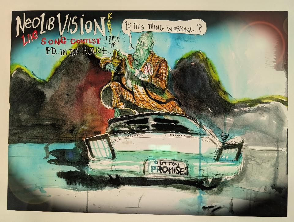 Dutton is pictured on a Toyota MR2 (same car Voyager took to the Eurovision stage) tapping a microphone "performing" in the "Neo Lib Vision Song Contest".